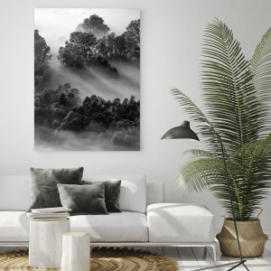 Mgła unosząca się wśród drzew nadaje krajobrazowi aurę tajemnicy i głębi. Połączenie światła i cienia tworzy niezwykły efekt wizualny, który przyciąga wzrok i budzi emocje. To propozycja dla osób ceniących minimalizm i eleganckie akcenty dekoracyjne.