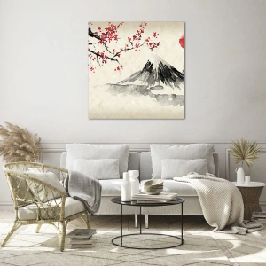 Obraz na szkle - Japońska akwarela z górą i kwitnącą gałęzią - 100x70cm - Pokochaj Japonię - Nowoczesna dekoracja ścienna do salonu, kuchni i sypialni ARTTOR
