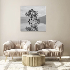Obraz na szkle - Samotne drzewo na wodzie w czarno-białym krajobrazie - 50x70cm - Jest taki kraj - Nowoczesna dekoracja ścienna do salonu, kuchni i sypialni ARTTOR