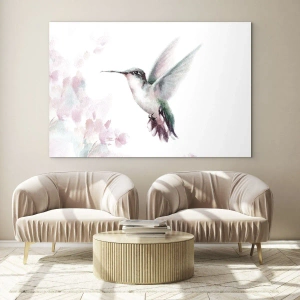 Symbolika kolibra kojarzy się z wdziękiem, energią i lekkością życia. W połączeniu z delikatnymi, pastelowymi odcieniami tła i kwiatów tworzy obraz, który wnosi do wnętrza poczucie swobody i inspiracji. To propozycja dla osób ceniących sztukę pełną subtelnych detali i harmonijnych barw.