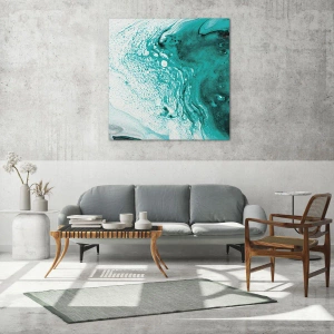 Dzięki dominującym odcieniom turkusu i bieli, dzieło wprowadza do wnętrza uczucie spokoju, a jednocześnie zachwyca swoją artystyczną ekspresją. Idealnie komponuje się w nowoczesnych salonach, biurach oraz innych przestrzeniach, które potrzebują stylowego akcentu. Obraz o wymiarach 70x50 cm jest wykonany na szkle, co dodatkowo podkreśla intensywność kolorów oraz subtelną fakturę powierzchni.