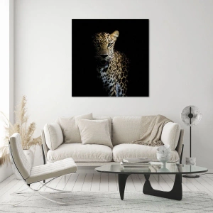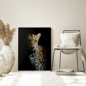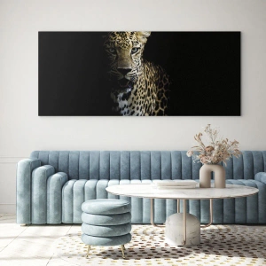 Obraz na szkle - Leopard na ciemnym tle z intensywnym spojrzeniem - 120x50cm - Mroczne piękno - Nowoczesna dekoracja ścienna do salonu i sypialni ARTTOR