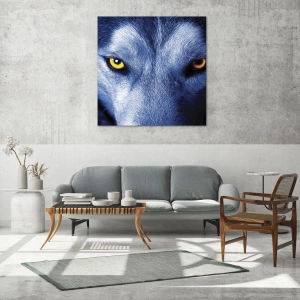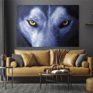 Obraz na szkle - Intensywne spojrzenie wilka w zbliżeniu na ciemnym tle - 140x50cm - Hipnotyzujące spojrzenie - Nowoczesna dekoracja ścienna do salonu i sypialni ARTTOR