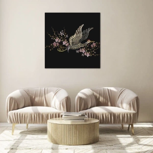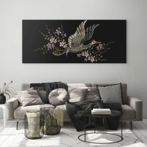 Obraz na szkle - Haftowany ptak w locie, z kwiatami w tle, na ciemnym tle - 100x70cm - Egzotyczny, haftowany ptak - Nowoczesna dekoracja ścienna do salonu, kuchni i sypialni ARTTOR