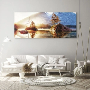 Obraz na szkle - Górski krajobraz o poranku z drzewami i odbiciem w jeziorze - 120x80cm - Natura w nowym świetle - Nowoczesna dekoracja ścienna do salonu, kuchni i sypialni ARTTOR