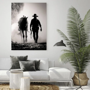 Obraz na szkle - Silhouette of a cowboy leading a horse through a misty landscape - 50x70cm - Teksański poranek - Nowoczesna dekoracja ścienna do salonu, kuchni i sypialni ARTTOR