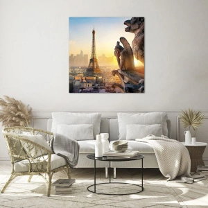 Obraz na szkle - Wieża Eiffla w porannej mgle, z widokiem na Paryż i gotyckie rzeźby - 50x70cm - Wiele się zmieniło… - Nowoczesna dekoracja ścienna do salonu, kuchni i sypialni ARTTOR