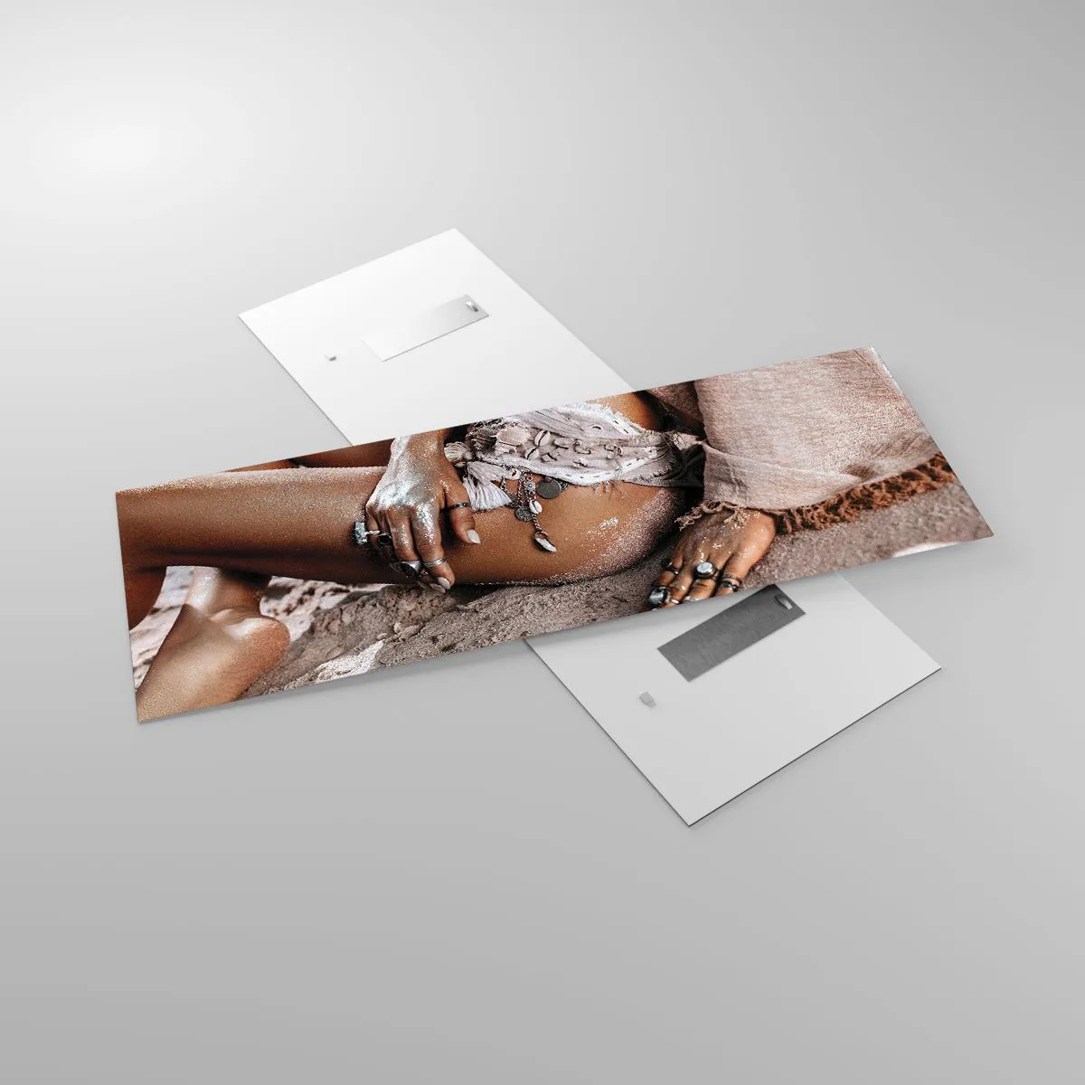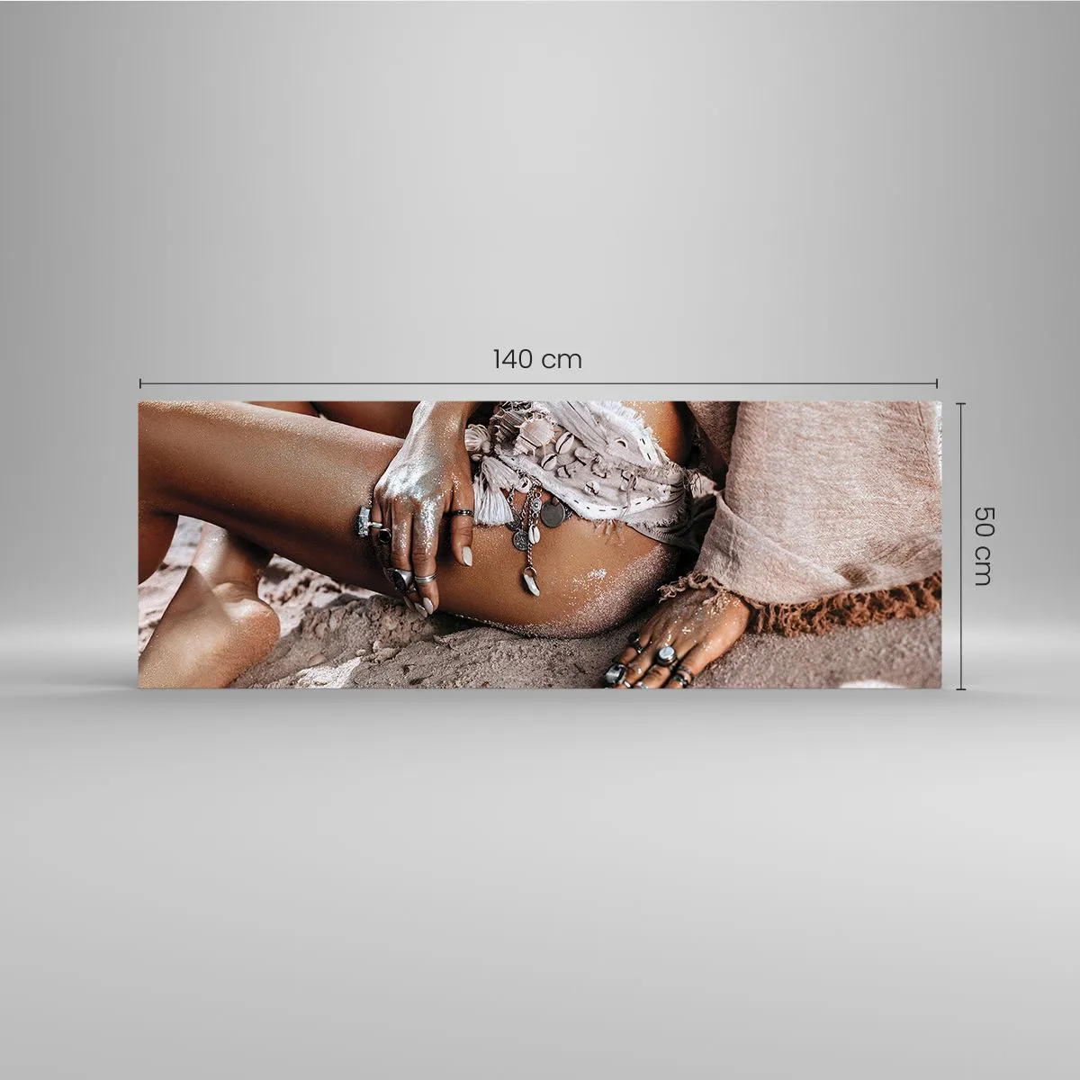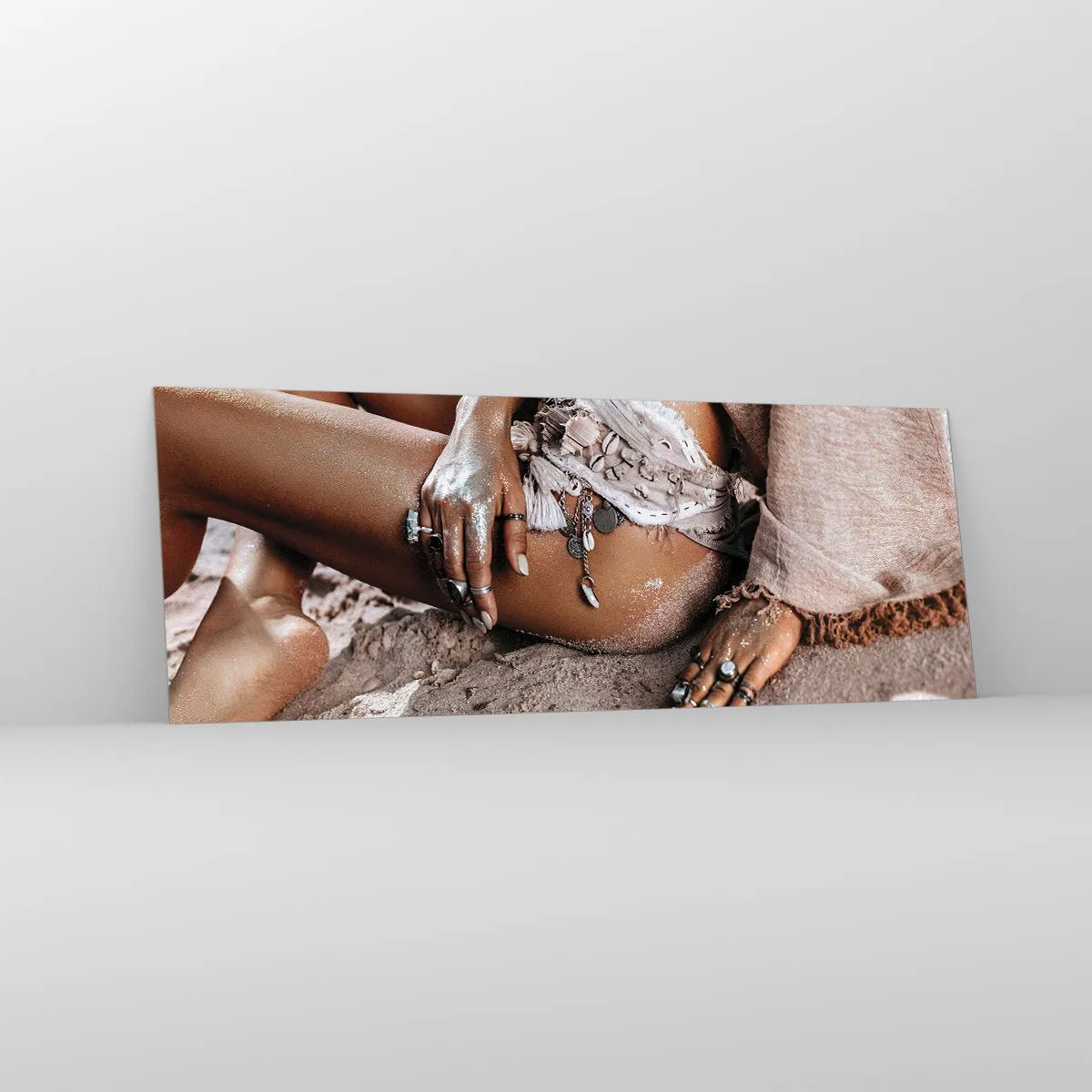 Obraz na szkle - Kobieta w stylu boho na plaży z biżuterią - 140x50cm - Wyrzucona przez fale? - Nowoczesna dekoracja ścienna do salonu i sypialni ARTTOR