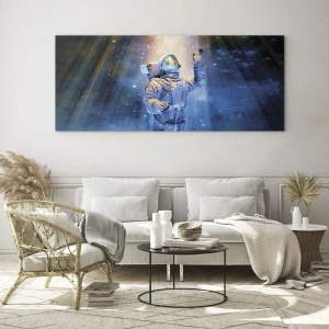 Obraz na szkle - Astronauta w kosmosie oświetlony promieniami światła - 50x70cm - Wreszcie u celu - Nowoczesna dekoracja ścienna do salonu, kuchni i sypialni ARTTOR