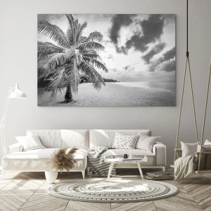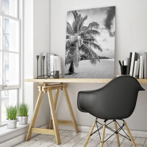 - Czarno-biały obraz przedstawiający samotną palmę na pustej plaży z zachmurzonym niebem. Minimalistyczna kompozycja wprowadza nastrój ciszy, refleksji i egzotycznego spokoju. Idealny do wnętrz z nutą melancholii i natury.