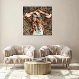 - Uśmiechnięta kobieta w stylizacji boho leży w sianie, otulona kolorami lata i swobodą natury. Pełen ciepła i wolności obraz wprowadza nastrój beztroski i pozytywnej energii do każdego wnętrza.