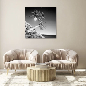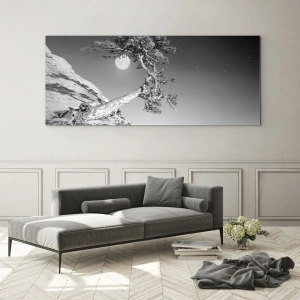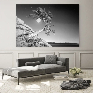 - Czarno-biały obraz przedstawia samotne, powyginane drzewo rosnące na zboczu skalistej góry. W tle widać pełnię księżyca, a całość tworzy niezwykle poetycki i symboliczny pejzaż nocny, pełen spokoju i mocy.