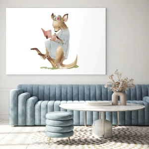 Obraz na szkle - Kangurzyca czytająca książkę z dzieckiem - 70x100cm - Poczytaj mi, mamo - Nowoczesna dekoracja ścienna do salonu i sypialni ARTTOR
