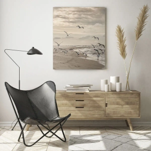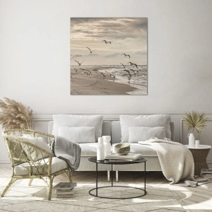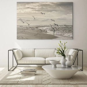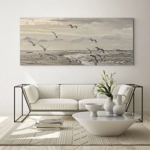Obraz na szkle - Mewa w locie nad nadmorskim krajobrazem - 120x50cm - Morza szum, ptaków śpiew - Nowoczesna dekoracja ścienna do salonu i sypialni ARTTOR