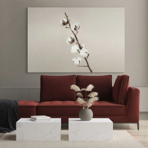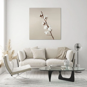Obraz na szkle - Gałązka bawełny na jasnym, minimalistycznym tle - 50x70cm - U źródła miękkości - Nowoczesna dekoracja ścienna do salonu, kuchni i sypialni ARTTOR