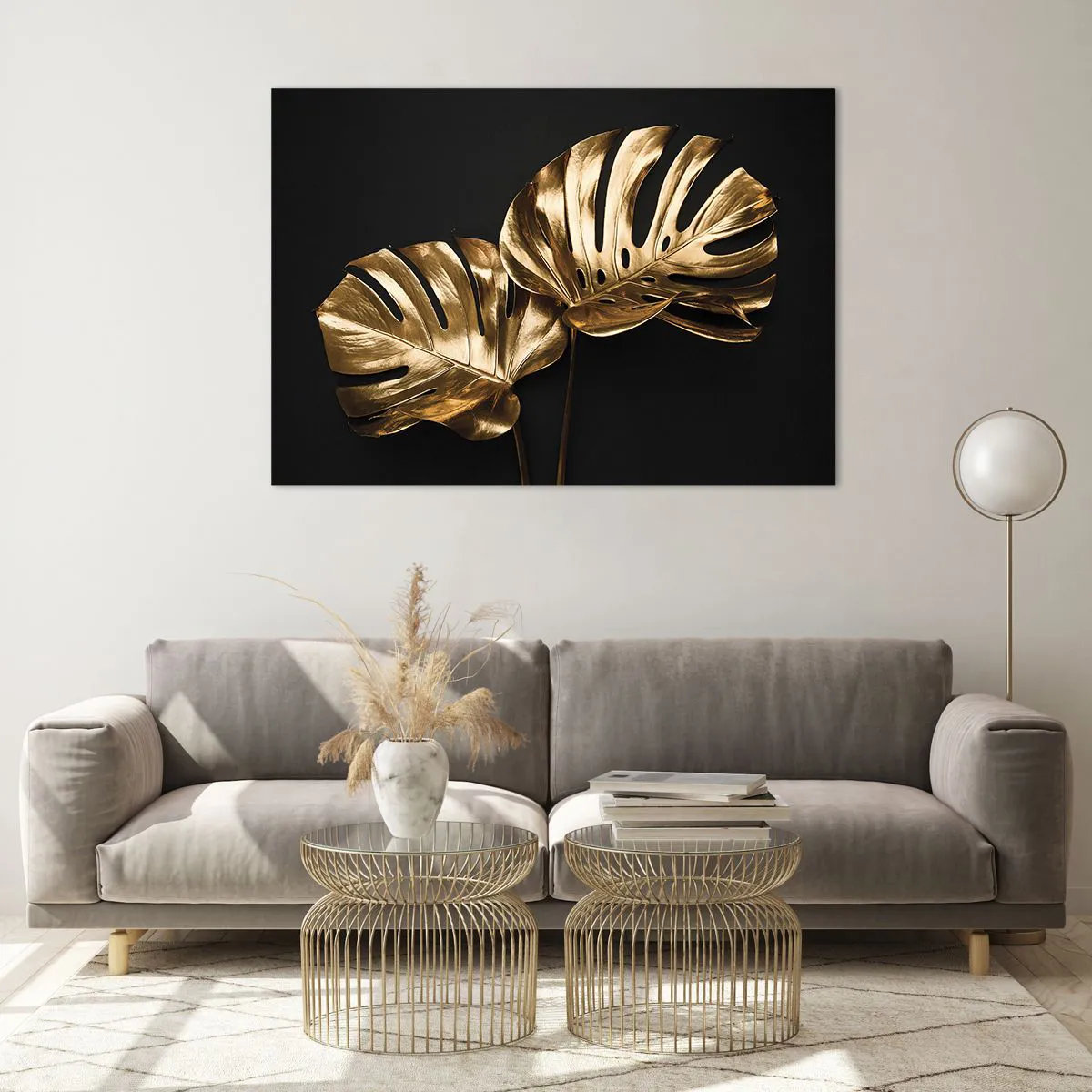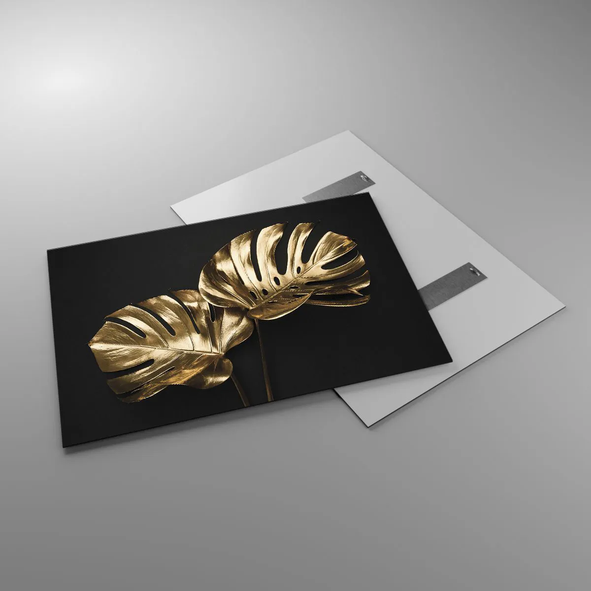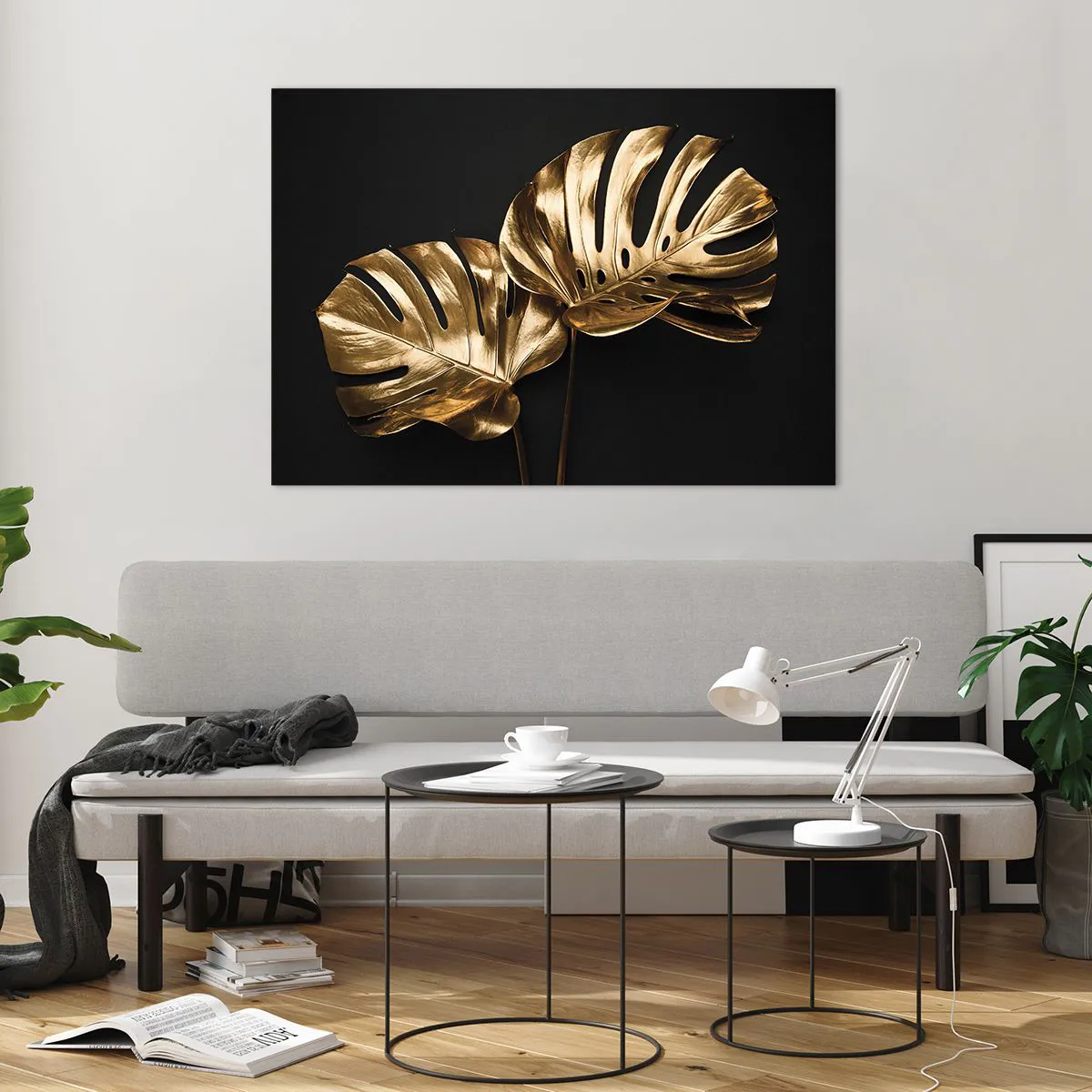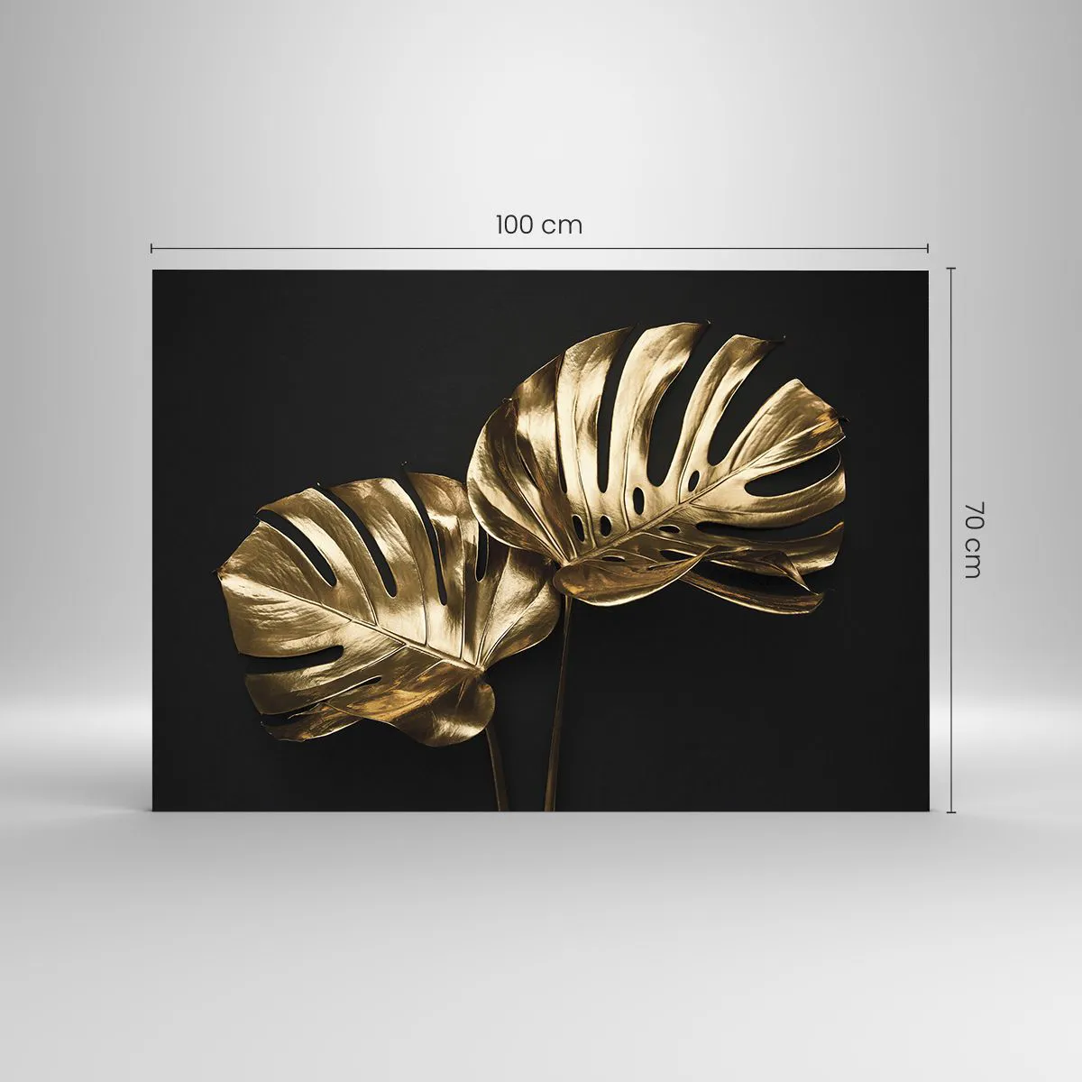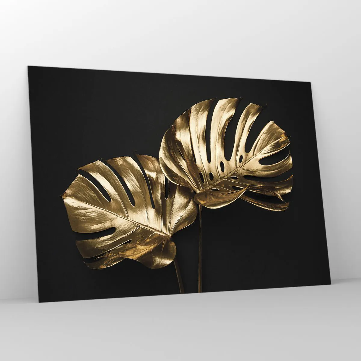 Obraz na szkle - Złote liście monstery na czarnym tle - 100x70cm - Skarby natury - Nowoczesna dekoracja ścienna do salonu, kuchni i sypialni ARTTOR