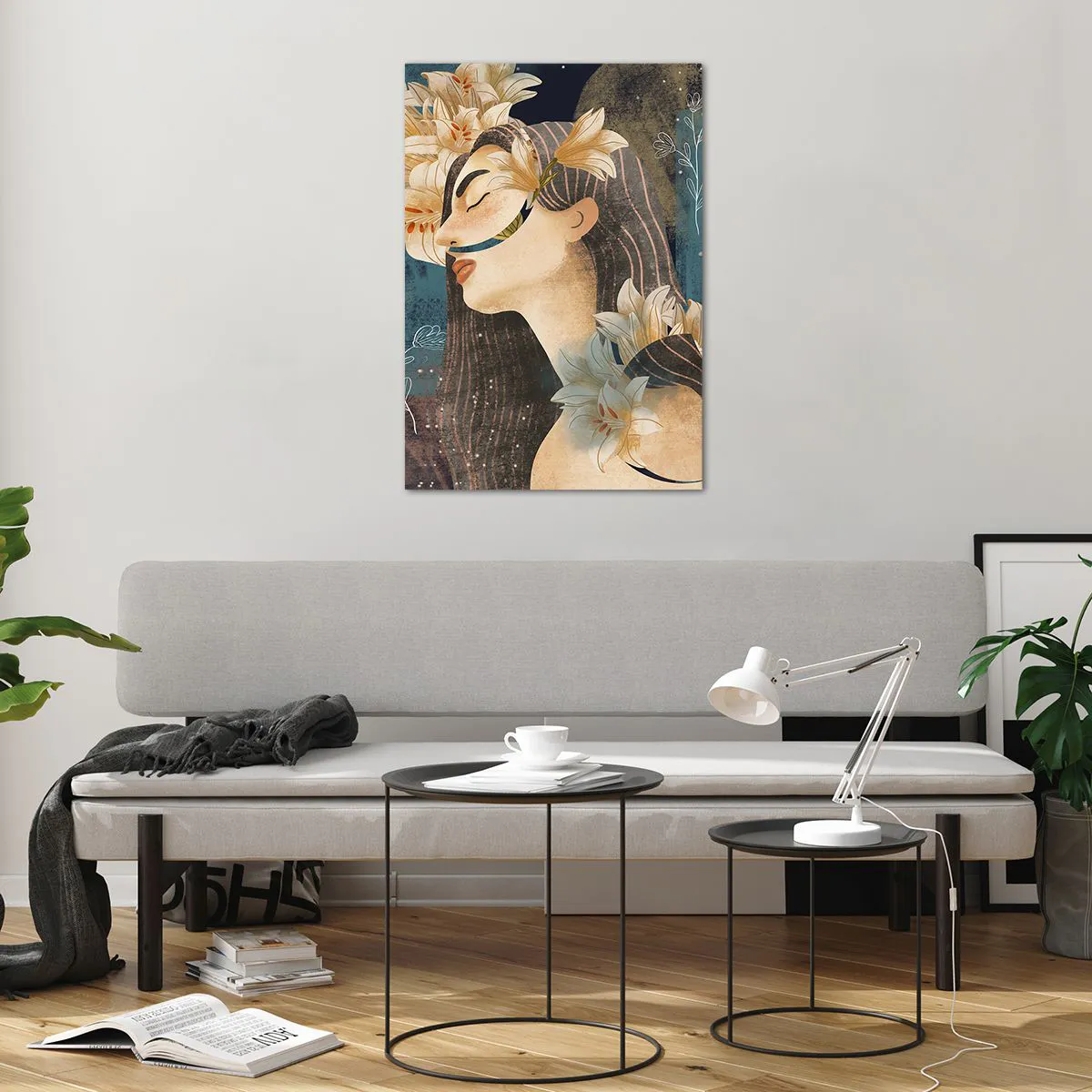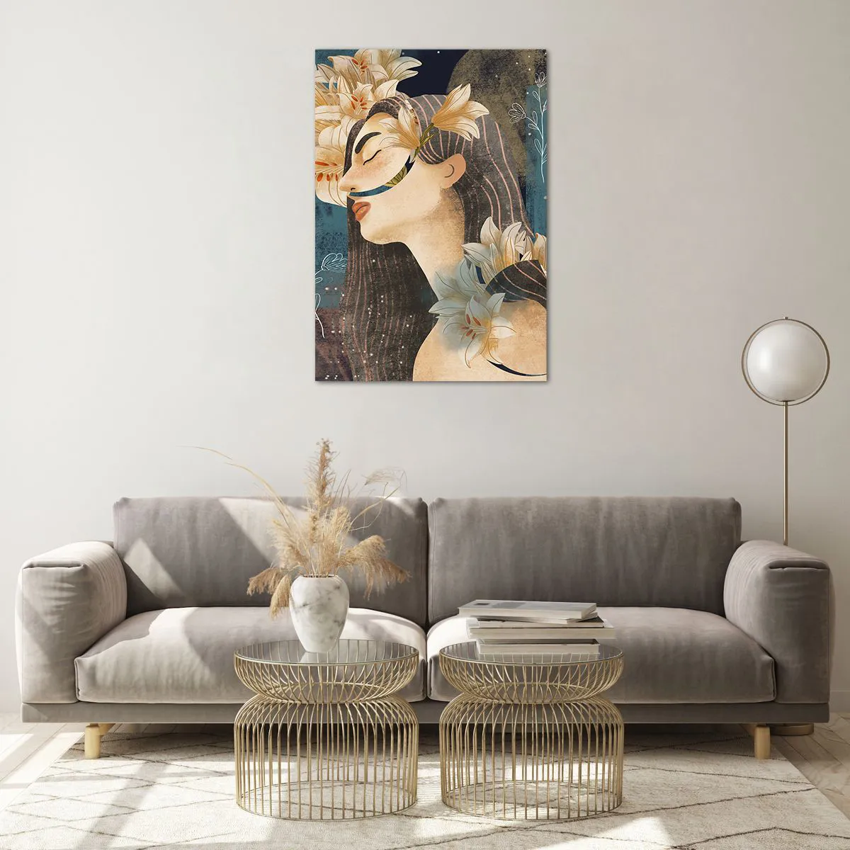 Obraz na szkle - Portret kobiety z kwiatami w artystycznym stylu na ciemnym tle - 70x100cm - Baśń o królewnie z liliami - Nowoczesna dekoracja ścienna do salonu i sypialni ARTTOR