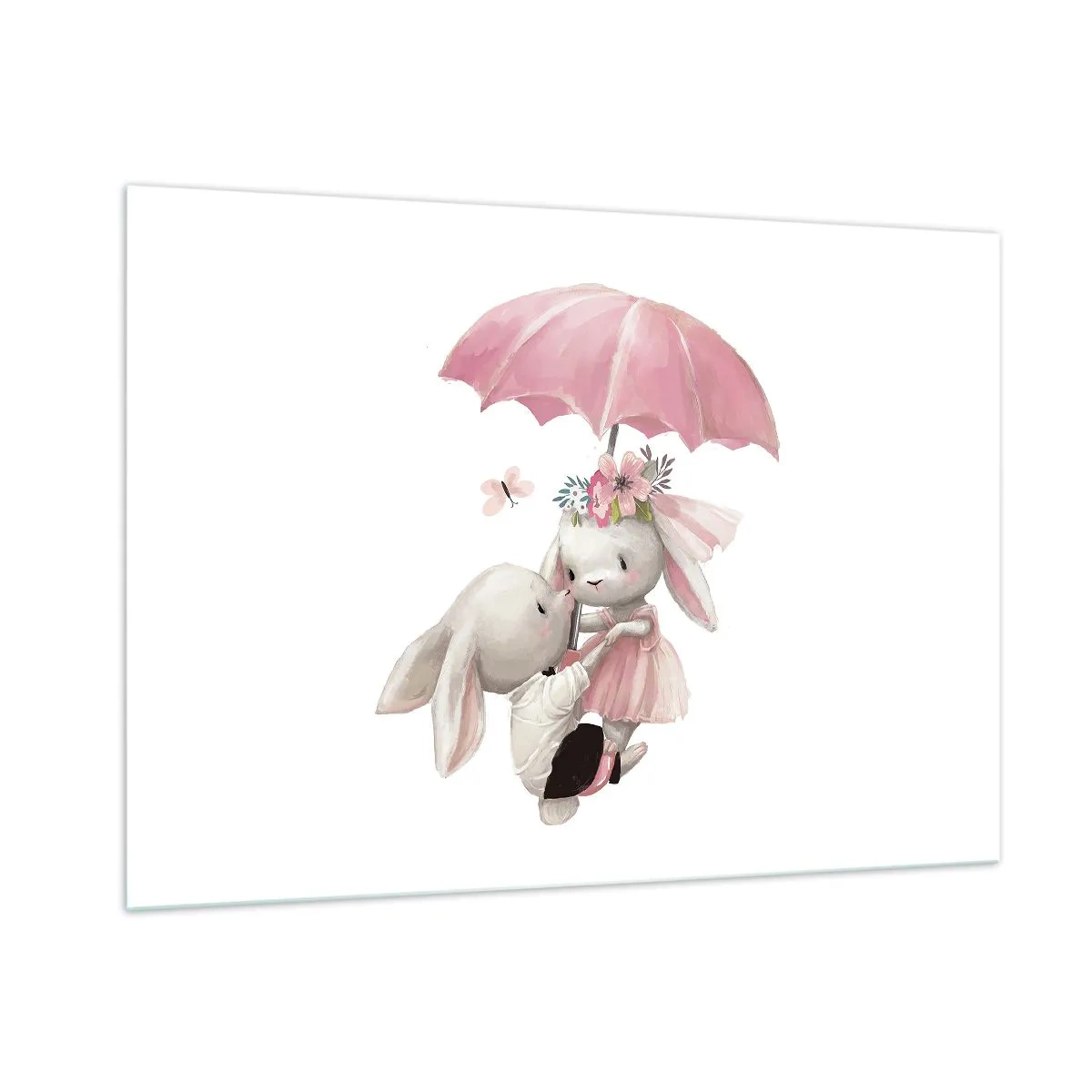 Obraz na szkle - Dwa króliki pod różowym parasolem w romantycznej scenie - 100x70cm - To właśnie miłość - Nowoczesna dekoracja ścienna do salonu, kuchni i sypialni ARTTOR