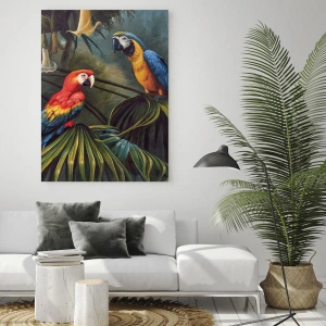 Obraz na szkle - Papugi w tropikalnym lesie na tle egzotycznych kwiatów - 70x100cm - Romantyzm w tropikach - Nowoczesna dekoracja ścienna do salonu i sypialni ARTTOR