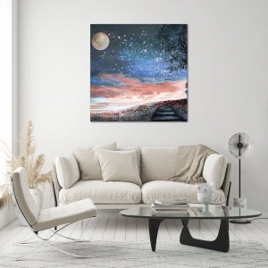 - Romantyczny obraz przedstawiający parę zakochanych pod rozgwieżdżonym niebem, na tle księżyca i bajkowego krajobrazu. Dekoracja pełna emocji, idealna do wnętrz z duszą.