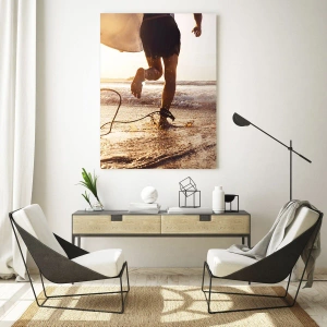 Obraz na szkle "Na spotkanie fali" to dynamiczna i pełna energii kompozycja, która przenosi nas na słoneczną plażę w chwili pełnej oczekiwania. Przedstawia surfera biegnącego po mokrym piasku z deską pod pachą, gotowego zmierzyć się z nadchodzącą falą. Scena została uchwycona w świetle zachodu słońca, co nadaje całemu ujęciu ciepłej tonacji i podkreśla emocjonalny charakter chwili.