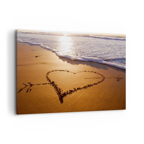 Obraz na płótnie - Serce z piasku na plaży podczas zachodu słońca - 100x70cm - Wakacyjne wyznanie - Nowoczesna dekoracja ścienna do salonu, kuchni i sypialni ARTTOR