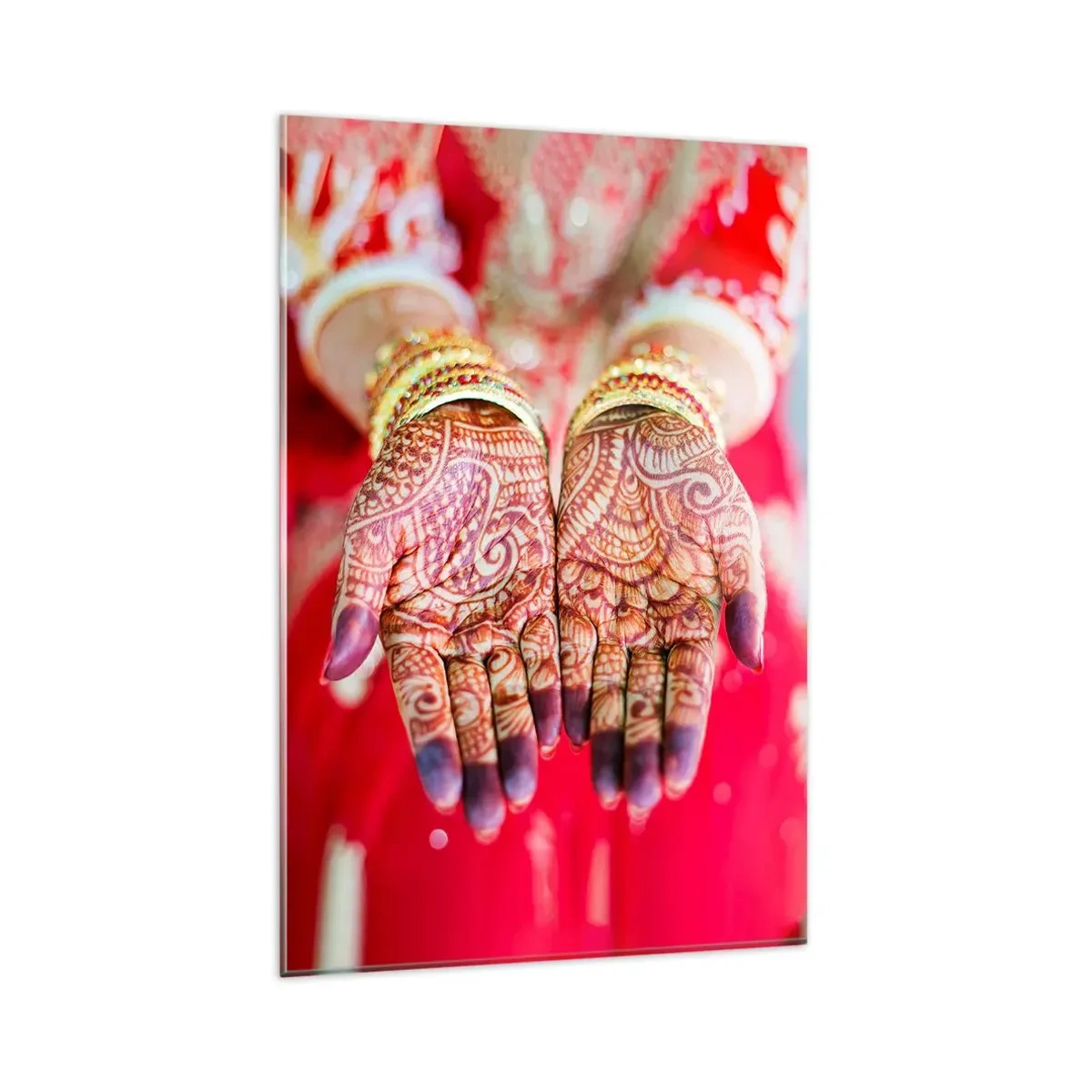 Obraz na szkle - Ozdobione dłonie z henną na tle czerwonej sukni - 80x120cm - Gotowa złapać szczęście - Nowoczesna dekoracja ścienna do salonu i sypialni ARTTOR
