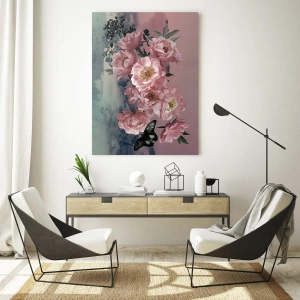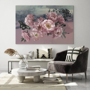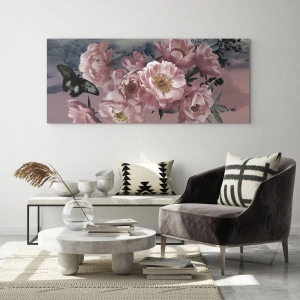 Obraz na szkle - Różowe piwonie z motylem na pastelowym tle - 120x50cm - Szczyt romantyzmu - Nowoczesna dekoracja ścienna do salonu i sypialni ARTTOR