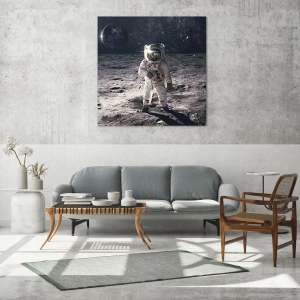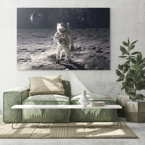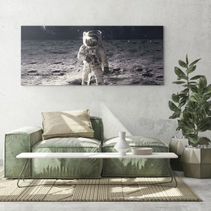 Obraz na szkle - Astronauta na powierzchni Księżyca z Ziemią w tle - 140x50cm - Pozdrowienia z Księżyca - Nowoczesna dekoracja ścienna do salonu i sypialni ARTTOR