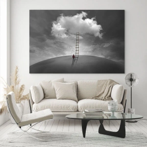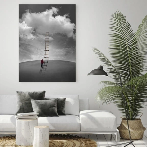 Obraz na szkle - Osoba w czerwonym płaszczu i drabina prowadząca do chmury - 120x50cm - Wszystko możliwe - Nowoczesna dekoracja ścienna do salonu i sypialni ARTTOR