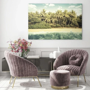 Taki obraz na szkle doskonale sprawdzi się jako element wystroju w stylu tropikalnym, boho, nadmorskim, ale także nowoczesnego wnętrza, gdzie może pełnić rolę relaksującego akcentu. Będzie idealny do salonu, sypialni, pokoju wypoczynkowego czy przestrzeni komercyjnych – takich jak gabinety SPA, pensjonaty czy kawiarnie inspirowane podróżami i naturą.