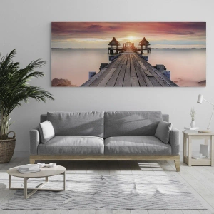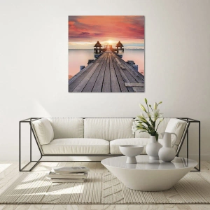 Obraz na szkle - Drewniane molo prowadzące do altanek nad wodą o zachodzie słońca - 120x80cm - Zachód na wschodzie - Nowoczesna dekoracja ścienna do salonu, kuchni i sypialni ARTTOR