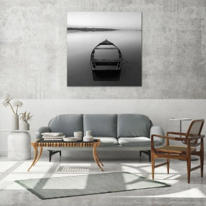 Obraz na szkle - Samotna łódź na spokojnym jeziorze w odcieniach czarno-białych - 120x50cm - Tęsknota i melancholia - Nowoczesna dekoracja ścienna do salonu i sypialni ARTTOR