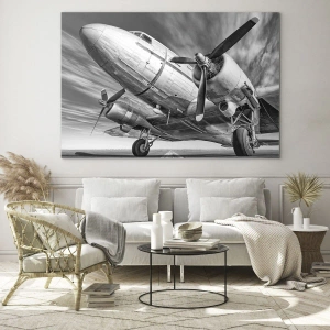 Obraz na szkle - Czarno-biały samolot z silnikami śmigłowymi na pasie startowym - 50x70cm - Zawsze gotowy do lotu - Nowoczesna dekoracja ścienna do salonu, kuchni i sypialni ARTTOR