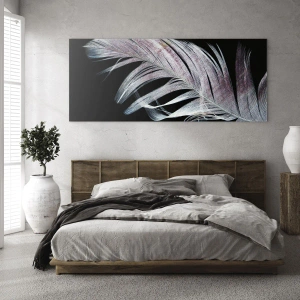 Obraz na szkle - Delikatne pióro na czarnym tle w artystycznym ujęciu - 120x80cm - Pomyśl o dotyku - Nowoczesna dekoracja ścienna do salonu, kuchni i sypialni ARTTOR