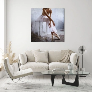 Obraz na szkle - Baletnica w tiulowej spódnicy odpoczywa w sali - 100x70cm - Zanim zabłysną światła rampy - Nowoczesna dekoracja ścienna do salonu, kuchni i sypialni ARTTOR