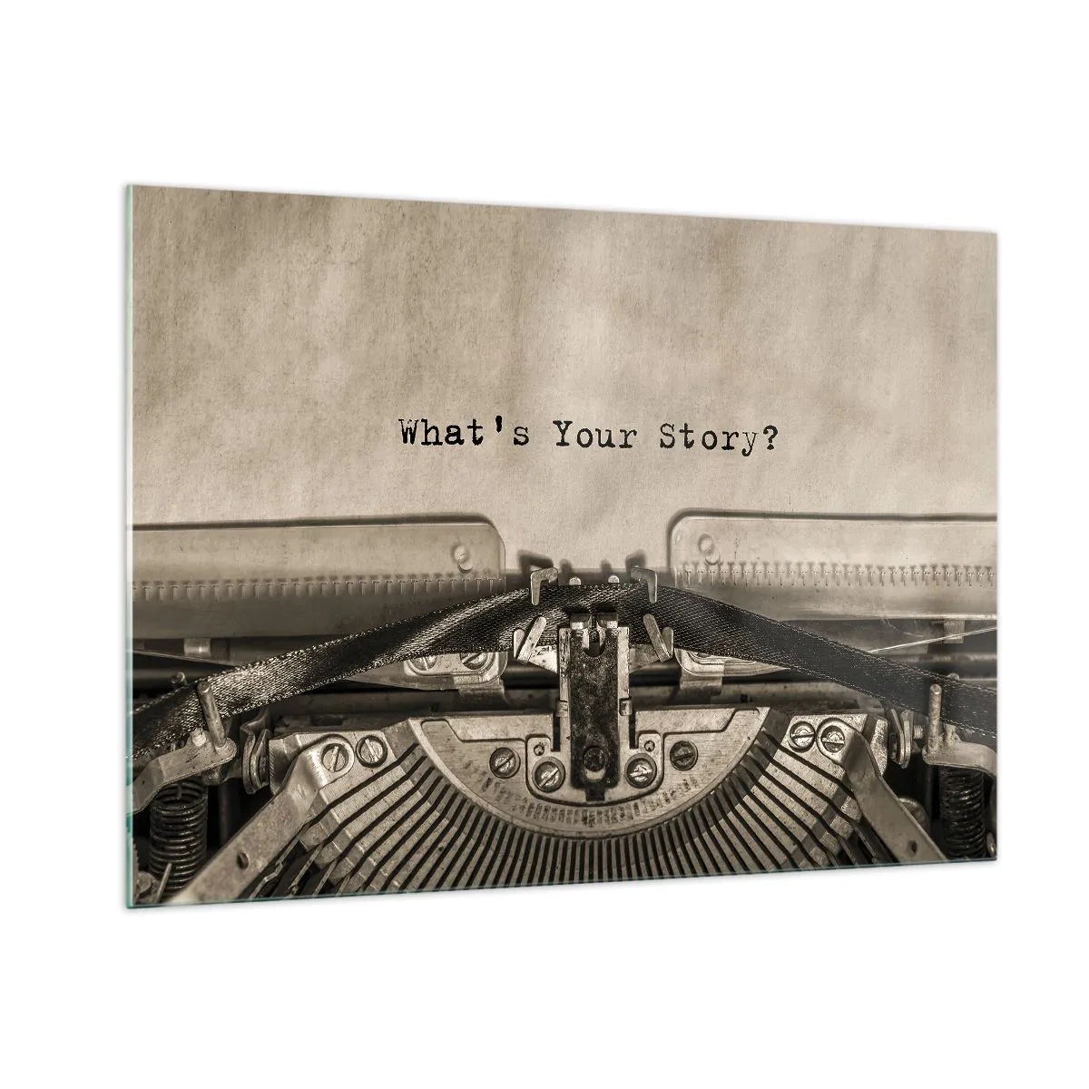 Obraz na szkle - Zbliżenie na maszynę do pisania z tekstem 'What's Your Story?' - 100x70cm - Opowiedz mi - Nowoczesna dekoracja ścienna do salonu, kuchni i sypialni ARTTOR