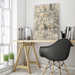 - Złożona kompozycja abstrakcyjna z geometrycznymi i szkicowymi liniami w odcieniach beżu i czerni. Obraz na szkle przyciąga wzrok swoją złożonością i nowoczesnym charakterem, idealny do wnętrz industrialnych i artystycznych.