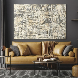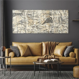 Obraz na szkle "Czeka na rozszyfrowanie" to graficzna zagadka, której pełne znaczenie zdaje się wymykać jednoznacznej interpretacji. Kompozycja złożona z niezliczonych Linia, kształtów i fragmentarycznych form tworzy dynamiczną Abstrakcja, która przyciąga uwagę i pobudza wyobraźnię. Na tle w odcieniach beżu i czerni rozgrywa się wizualna opowieść o Chaosie, strukturze i próbie ich zrozumienia.