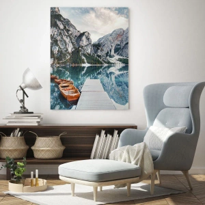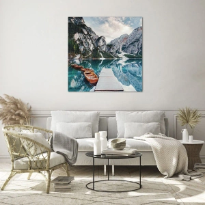Obraz na szkle - Drewniany pomost nad turkusowym jeziorem w górach - 120x80cm - Pokażemy ci piękno - Nowoczesna dekoracja ścienna do salonu, kuchni i sypialni ARTTOR