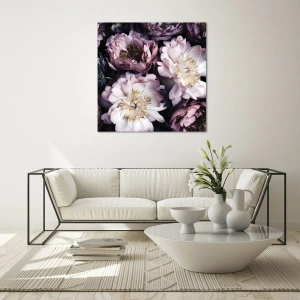 Obraz na szkle - Romantyczny bukiet piwonii w stonowanych fioletach i różach - 70x50cm - Bukiet w dawnym stylu - Nowoczesna dekoracja ścienna do salonu i sypialni ARTTOR