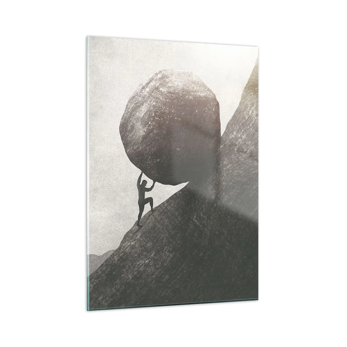 Obraz na szkle - Postać pchająca głaz pod górę na tle górskich krajobrazów - 50x70cm - Wierzę wbrew nadziei - Nowoczesna dekoracja ścienna do salonu, kuchni i sypialni ARTTOR