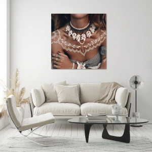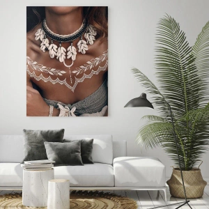 Obraz na szkle - Zbliżenie kobiety w naszyjniku z muszli i białym tatuażu - 50x70cm - Talizmany, rytuały kobiecości - Nowoczesna dekoracja ścienna do salonu, kuchni i sypialni ARTTOR