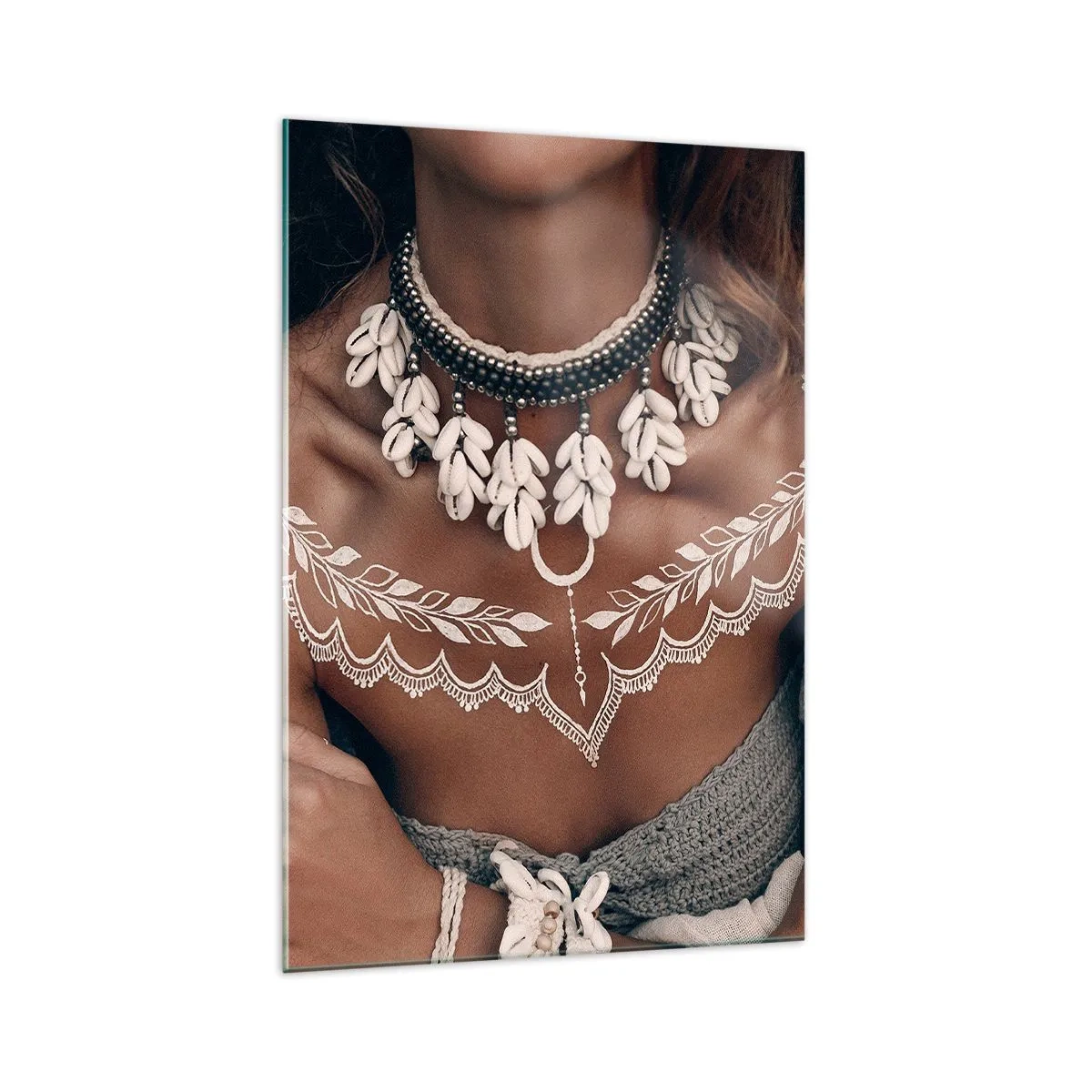 Obraz na szkle - Styl boho z biżuterią z muszli i koronkowym wzorem - 70x100cm - Talizmany, rytuały kobiecości - Nowoczesna dekoracja ścienna do salonu i sypialni ARTTOR
