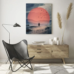 Obraz na szkle - Sylwetka mężczyzny na polu z wielkim czerwonym słońcem w tle - 80x120cm - W swoich żywiołach - Nowoczesna dekoracja ścienna do salonu i sypialni ARTTOR