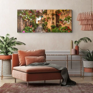 - Obraz na płótnie o wymiarach 70x50 cm przedstawiający malowniczą uliczkę wypełnioną kolorowymi kwiatami i doniczkami. Doskonała dekoracja dla miłośników natury i romantycznego klimatu.