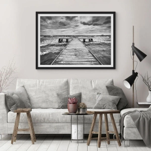 Plakat w czarnej ramie - Czarno-biały widok drewnianego pomostu nad wzburzonym morzem - 70x50cm - Czekam na wiatr, co rozgoni… - Nowoczesna dekoracja ścienna do salonu i sypialni ARTTOR