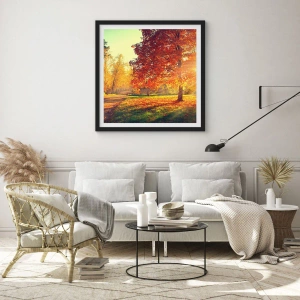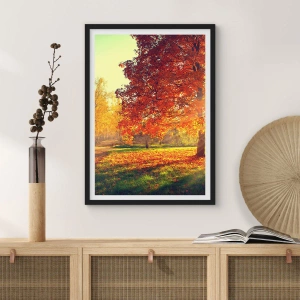 Plakat w czarnej ramie - Jesienny park oświetlony promieniami słońca - 70x50cm - Rude jest piękne - Nowoczesna dekoracja ścienna do salonu i sypialni ARTTOR