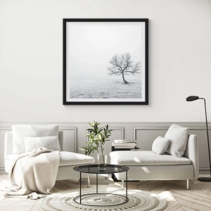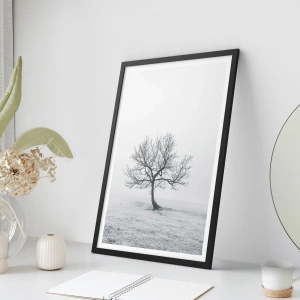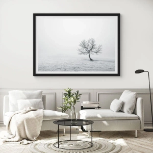Plakat w czarnej ramie - Samotne drzewo w zimowej mgle na pustym polu - 70x50cm - Przeciw nicości - Nowoczesna dekoracja ścienna do salonu i sypialni ARTTOR