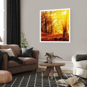 Plakat - Zachód słońca oświetlający jesienny las pełen złotych liści - 50x70cm - Ku złotej polanie - Nowoczesna dekoracja ścienna do salonu, kuchni i sypialni ARTTOR